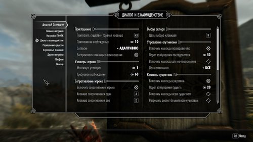 Совместимость: есть внутренняя совместимость с Defeat, Convenient Horses(совместимость функции диалога с конем). Так же работает с One With Nature и рекомендуется для взаимодействия с остальной дикой природой.