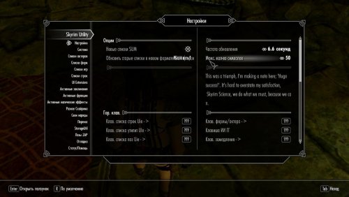 Здесь вы можете задать свои «горячие клавиши» для выбора актера, управления ИИ ПК, меню колеса пользовательского интерфейса (для позирования на лету), меню списка пользовательского интерфейса для списков поз. Вы также можете сохранять и загружать свои настройки MCM.