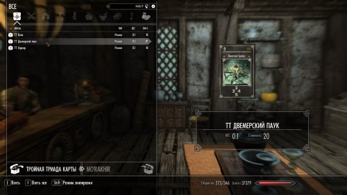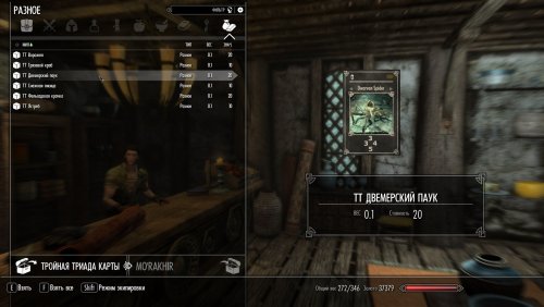 Чтобы сыграть в Тройную Триаду, вам потребуется игровая доска в вашем инвентаре и как минимум 5 карт в вашем сундуке с картами. Купить доску и стартовый набор карт можно у торговца. Я брал у Белетора из Вайтрана. Также карты будут находиться в виде лута у NPC и их можно будет выигрывать.