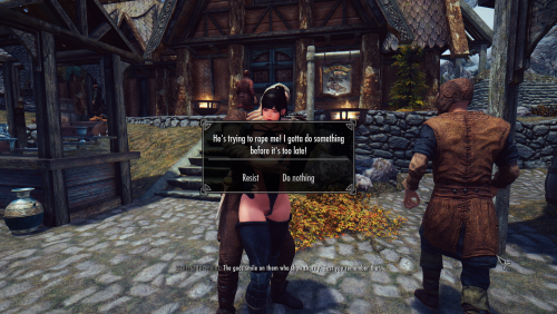 Этот мод добавляет случайные встречи НПС и игрока. При встречах НПС, при определённых условиях захватит игрока с целью насилия. Он обнимет игрока, прижмётся и постарается уложить на землю, что бы продемонстрировать героине "реалии" Скайрима. Выпустив пар, НПС уйдёт. У игрока, в момент захвата насильником, появится шанс сопротивляться либо послушно позволить НПС сделать своё чёрное дело. Вышло так, что после удачного сопротивления игрока НПС не будет вас преследовать, а станет убегать от вас с криком возмущения, что вы не позволили ему снять сексуальное возбуждение. Плохая девочка не позволяет себя трогать. Как в картинной галерее: смотреть смотри, а руками не трогай. Ай яй яй! Как не стыдно людей дразнить. А если серьёзно, то автор мода пытался сделать так, что бы НПС преследовал игрока, а получилось наоборот. Ситуация вышла несколько комичной и автор принял решение оставить этот забавный баг. Шанс сопротивления, шанс нападения, время нападения и необходима ли эротическая броня (настраивается в SexLab Aroused) настраивается в меню МСМ. Есть возможность настроить будут ли женщины нападать на игрока.