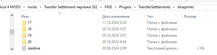 Новые чертежи будут записаны в папку оверрайт в том случае, если в папке "Переноса поселений" (Transfer Settlements\F4SE\Plugins\TransferSettlements\blueprints) нет пустых папок, Если пустые папки есть, чертежи будут записаны в них,