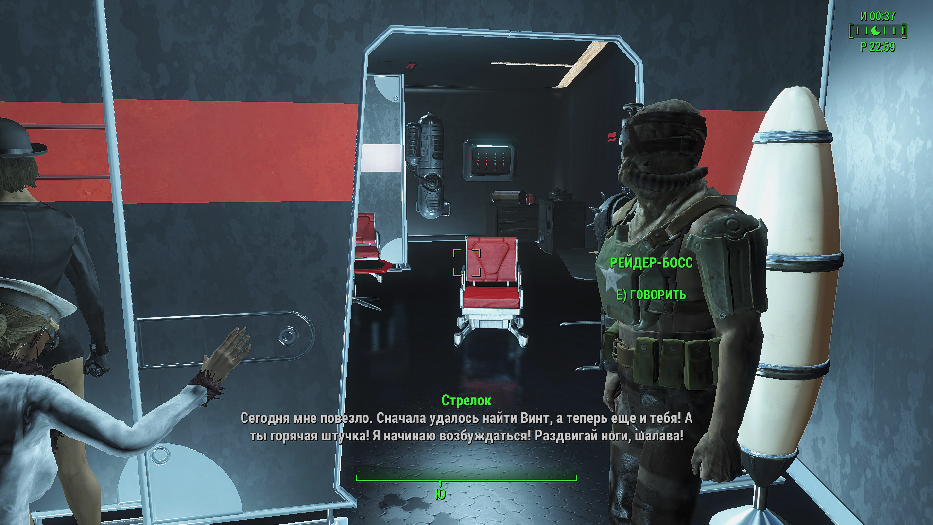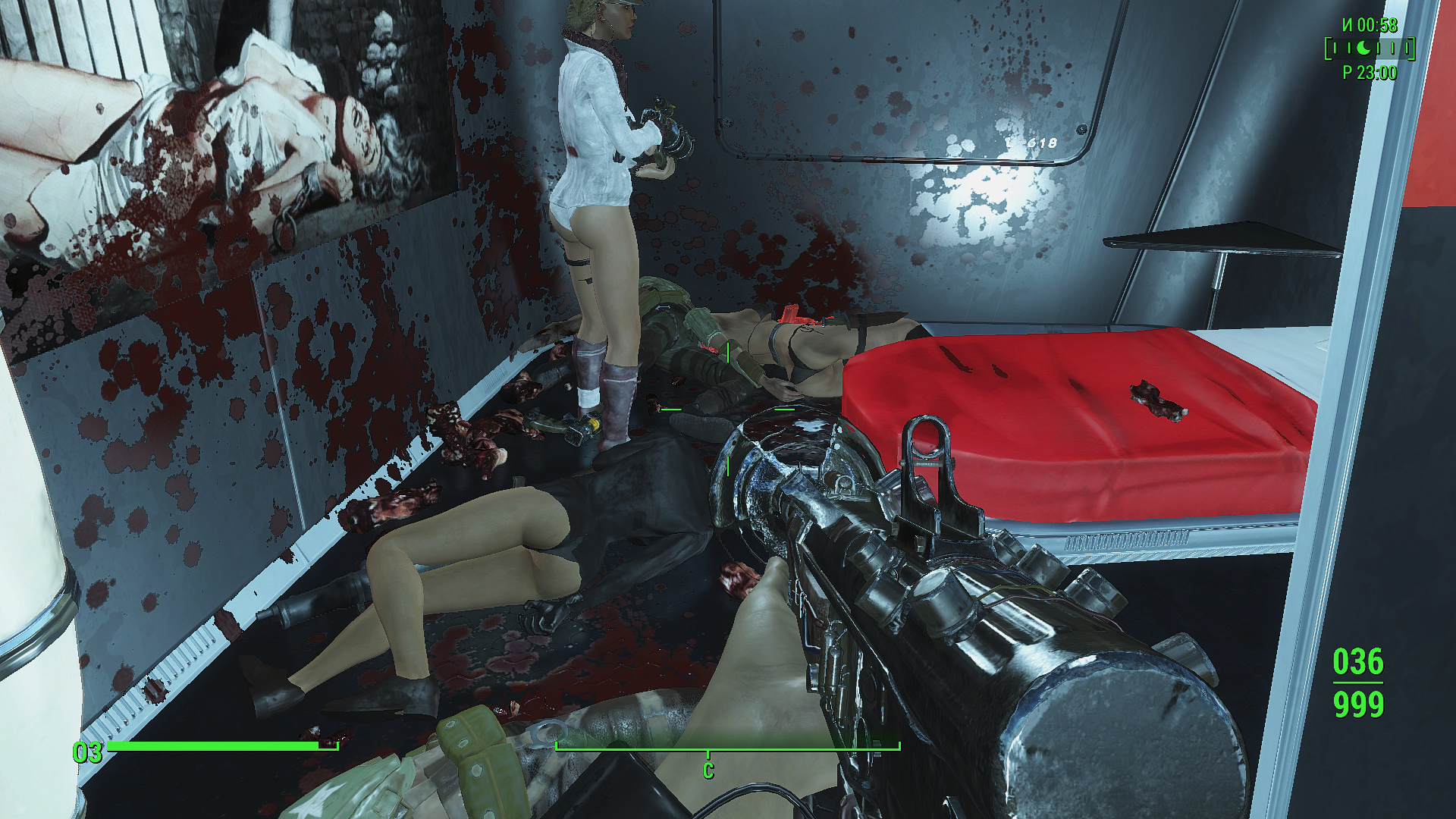 3. К 35 уровню имею 50 000 крышек - периодически торгую с братством Золота. Поэтому деньги от проституции ЖГГ уже не нужны. Спускает пар моя красавица с брутальными охранниками Даймондсити (мод Зрители отключен). Берет пару мужиков и веселится. Но их в помещении четверо, однако ни разу не появилось сообщение, что секс кто-то видел. У них там круговая порука, что-ли? Своих телочек не выдают?