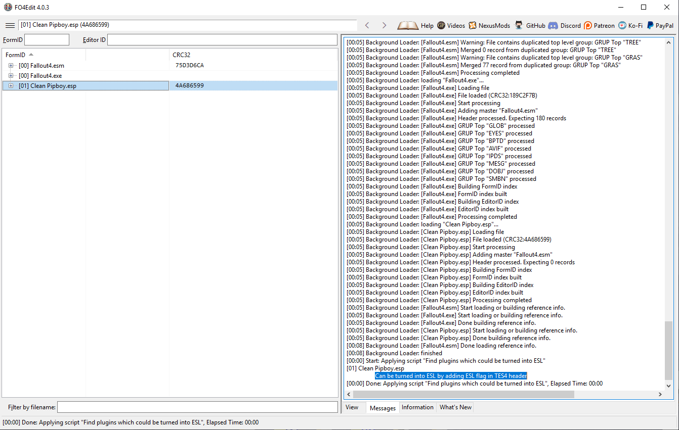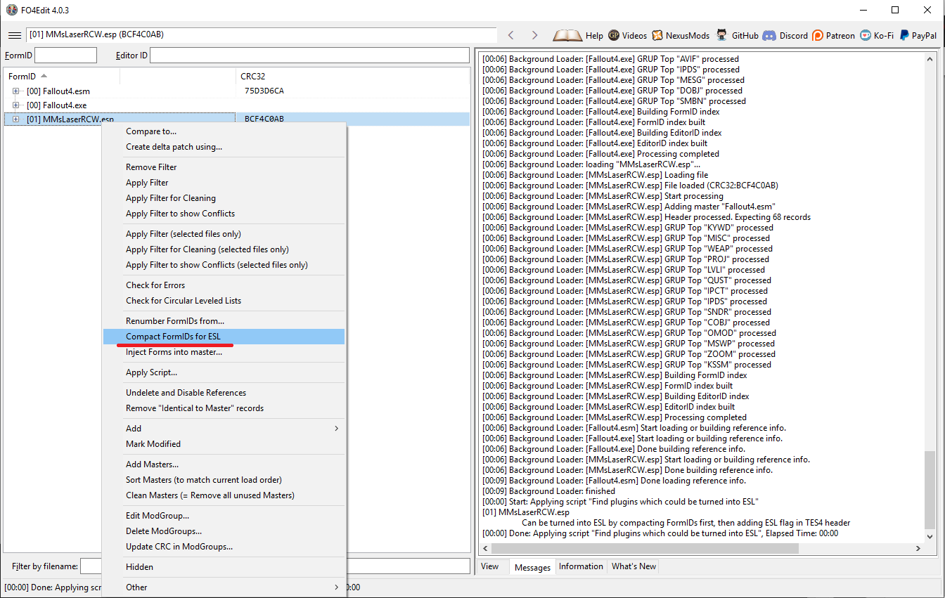 если увидишь текст "Can be turned into ESL by compacting FormIDs first, then adding ESL flag in TES4 header" (может быть обращён в ESL после сжатия FormID и добавления флага ESL), то сперва сжимаем FormID: