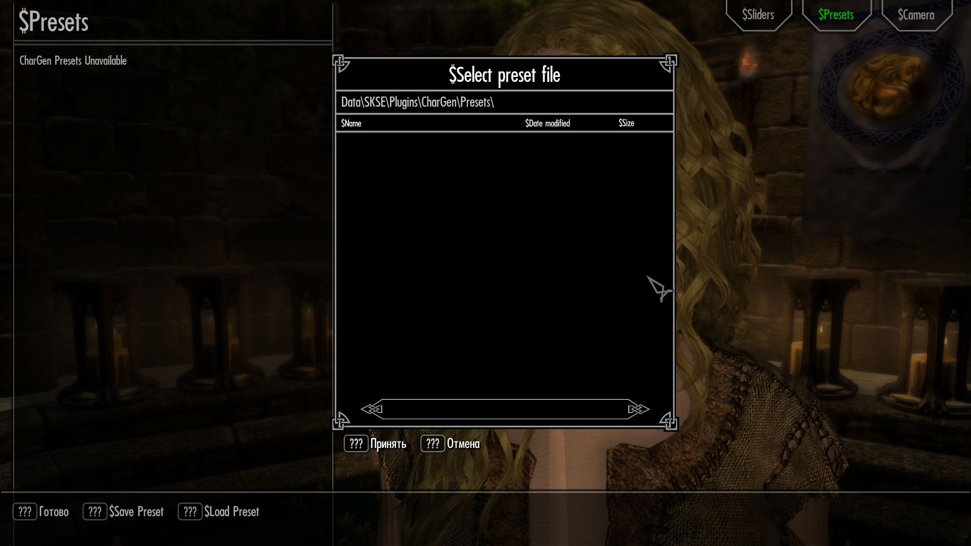 Вопрос первый, можно ли поставить пресеты из скайрима, у меня вообще никакие пресеты не отображаются, даже те которые сохраняю в игре.