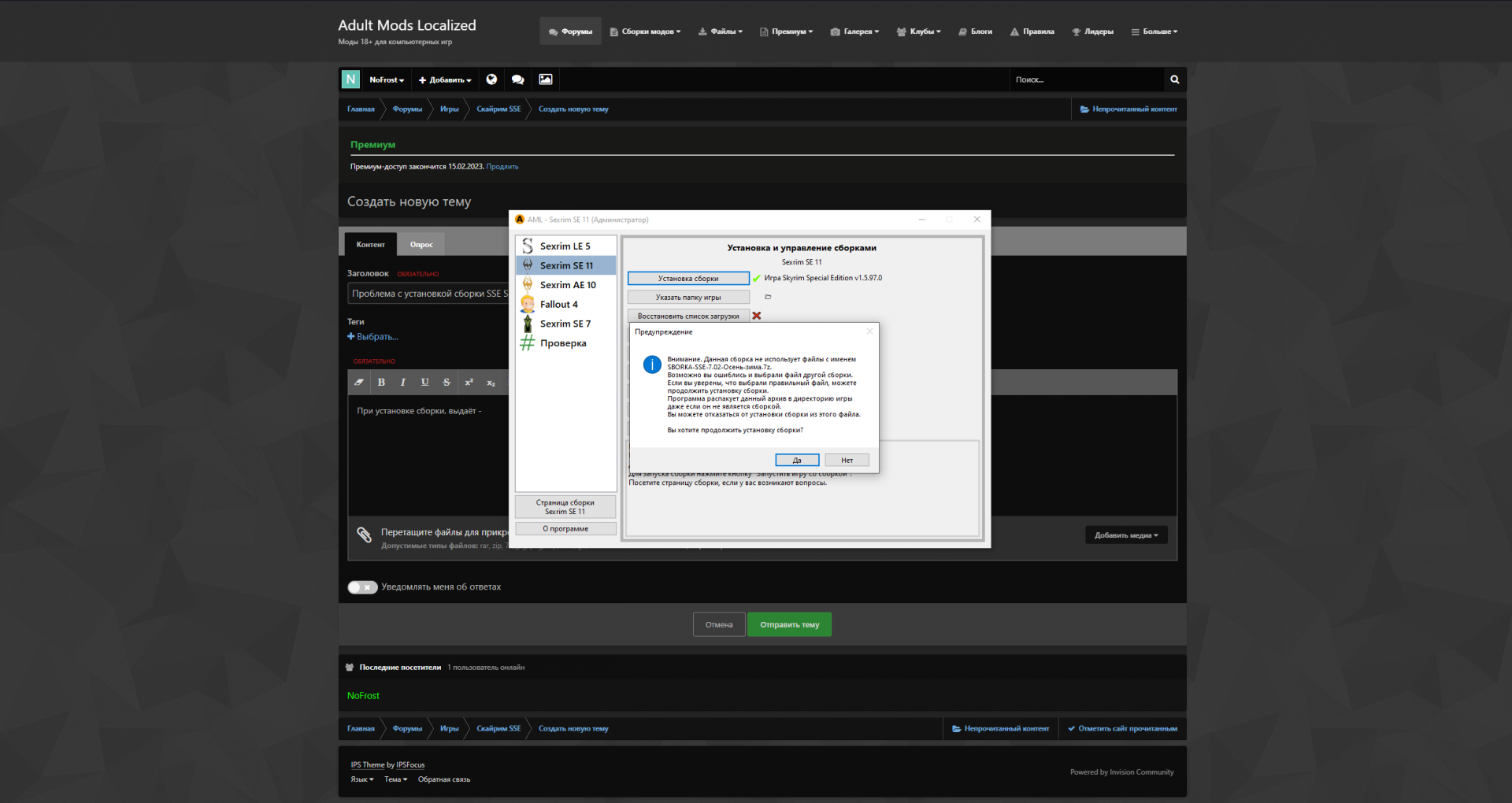 Вы пытаетесь установить Sexrim SE 7 через меню для Sexrim SE 11