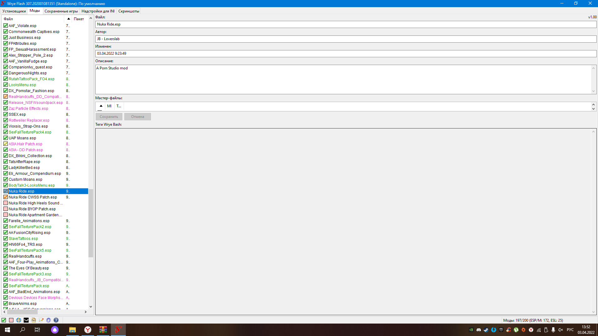 Появилась новая версия 4.1 мода AAF Nuka Ride: A Porn Studio Mod(уже с русским языком). Плиз можно перезалить этот мод в сборке. Скачала пока с ловерслаба( и там какая то проблема что не могу запустить три файла, а почему в душе