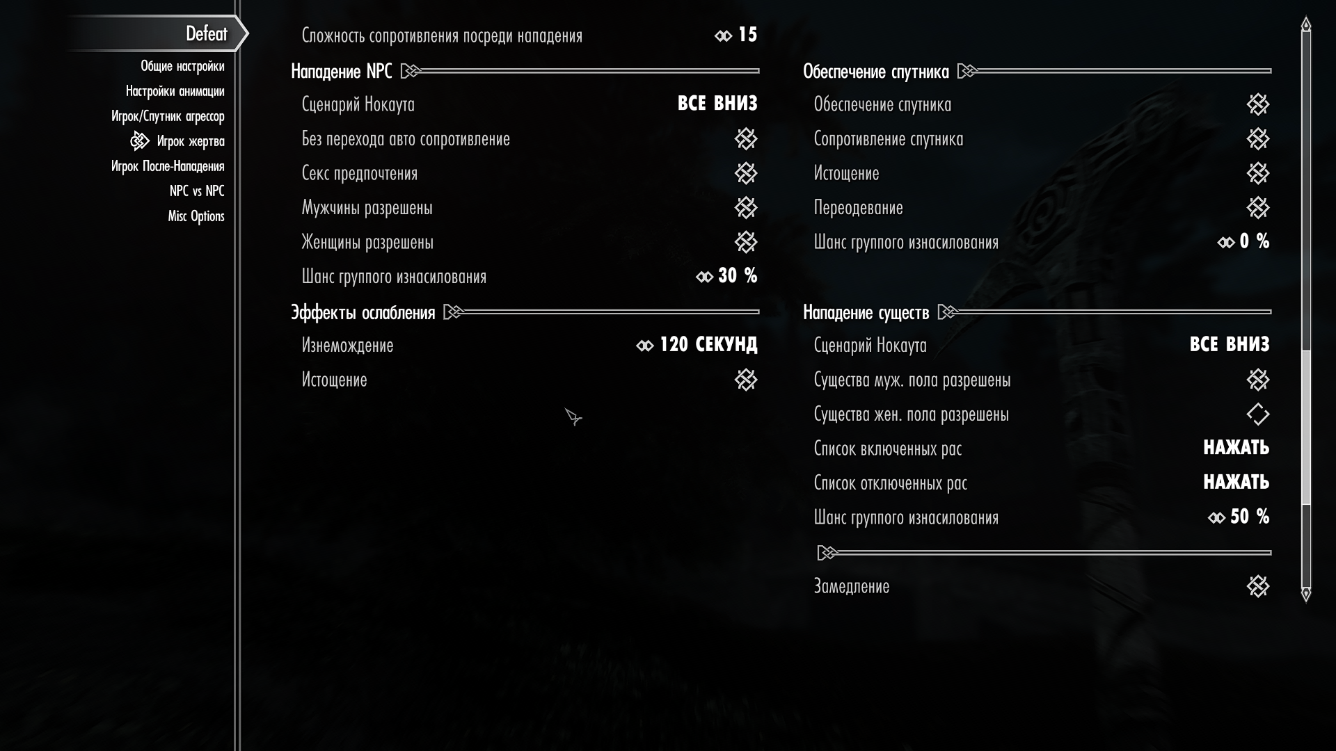 Приветствую,а где включать в Defeat поражение от существ,все по-русски,но я не найду этого,кому не трудно,ответьте.