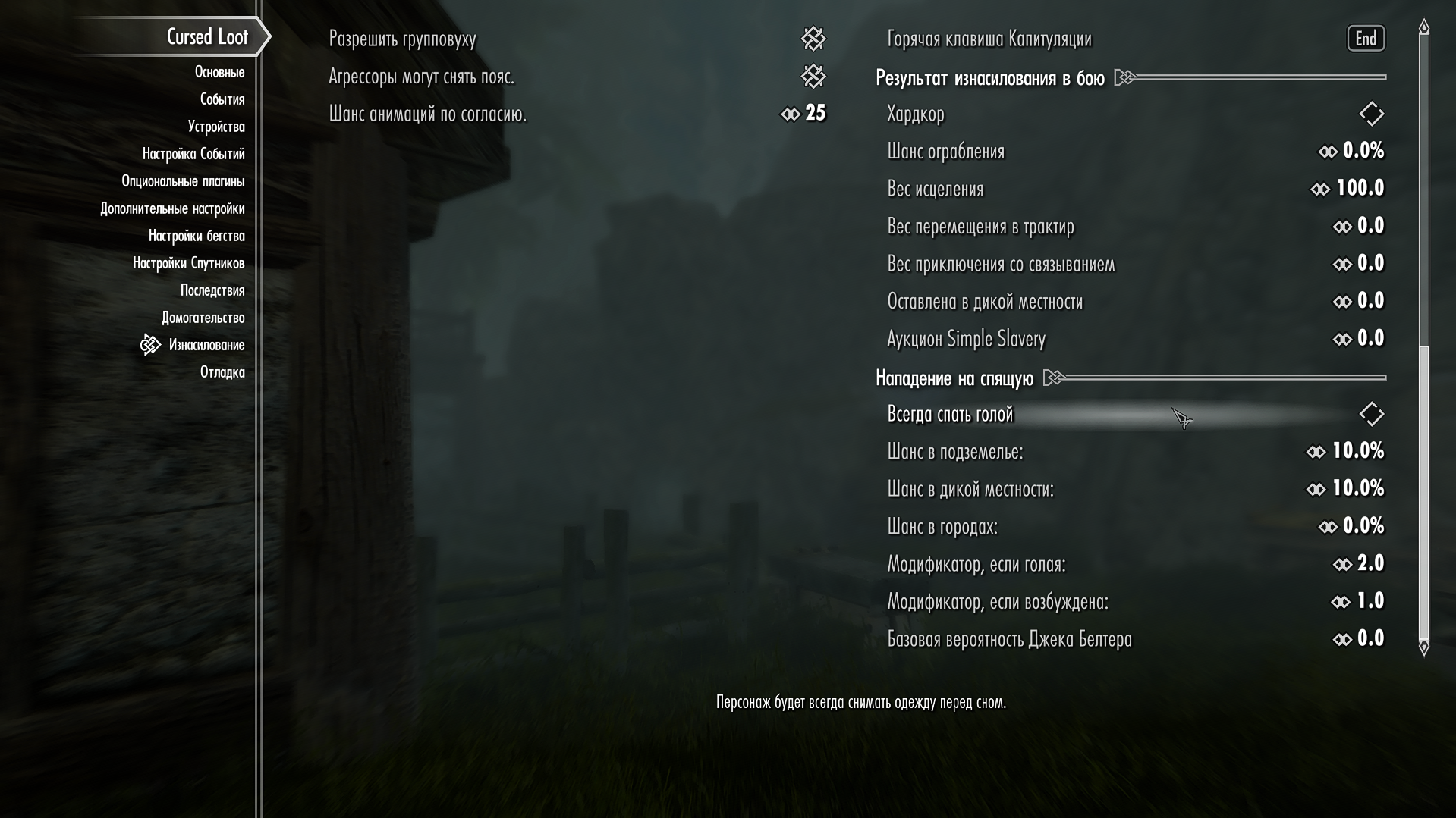 @Sebrik Я сталкивался со автосниманием одежды в моде Cursed Loot. Раздел "Изнасилование"(!) => "Нападение на спящую" => "Всегда спать голой". Это отключается.