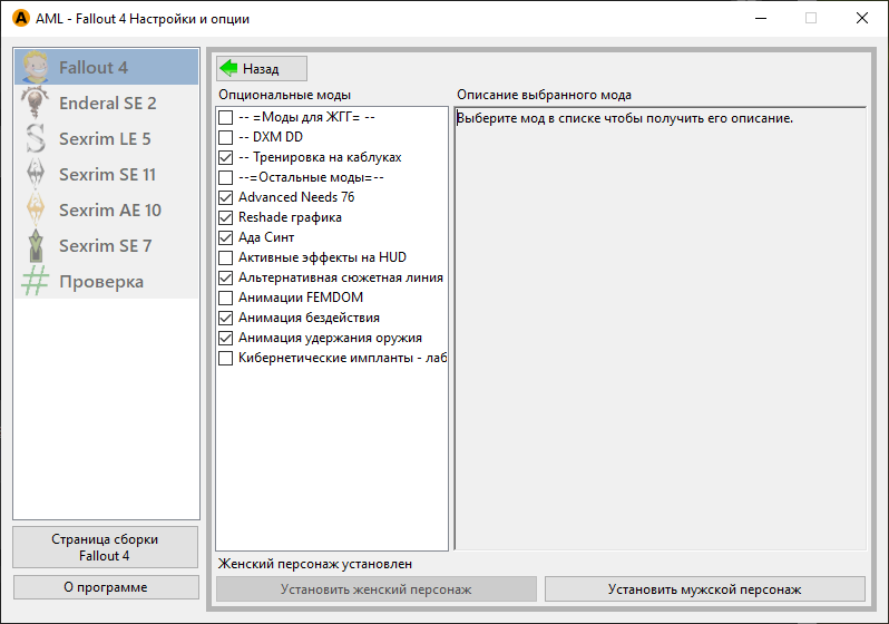 Требуемая версия игры: строго - Fallout 4 - 1.10.163.0 с 6 или 7 DLC. Другие версии несовместимы!