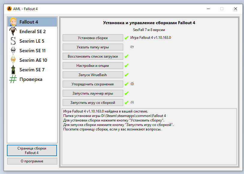 Требуемая версия игры: строго - Fallout 4 - 1.10.163.0 с 6 или 7 DLC. Другие версии несовместимы!