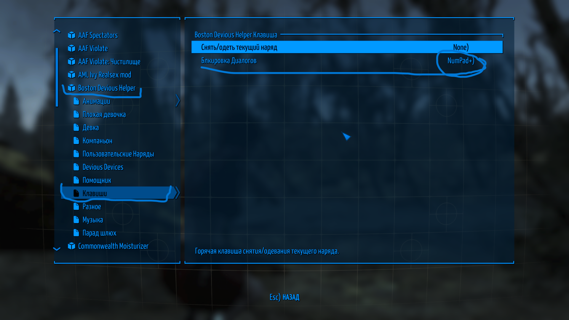 Горячие клавиши модов могут срабатывать когда вы их нажимаете переименовывая оружие и броню на верстаке. Это может привести к включению не нужных вам режимов в которых могут исчезнуть стандартные диалоги у НПС, а так же перестать работать какие либо действия игрока. В этой версии сборки мы отключили почти все конфликтные горячие клавиши. Все необходимые режимы вы можете включить в главном меню настроек модов не используя горячих клавиш. Назначать горячие клавиши не рекомендуется.
