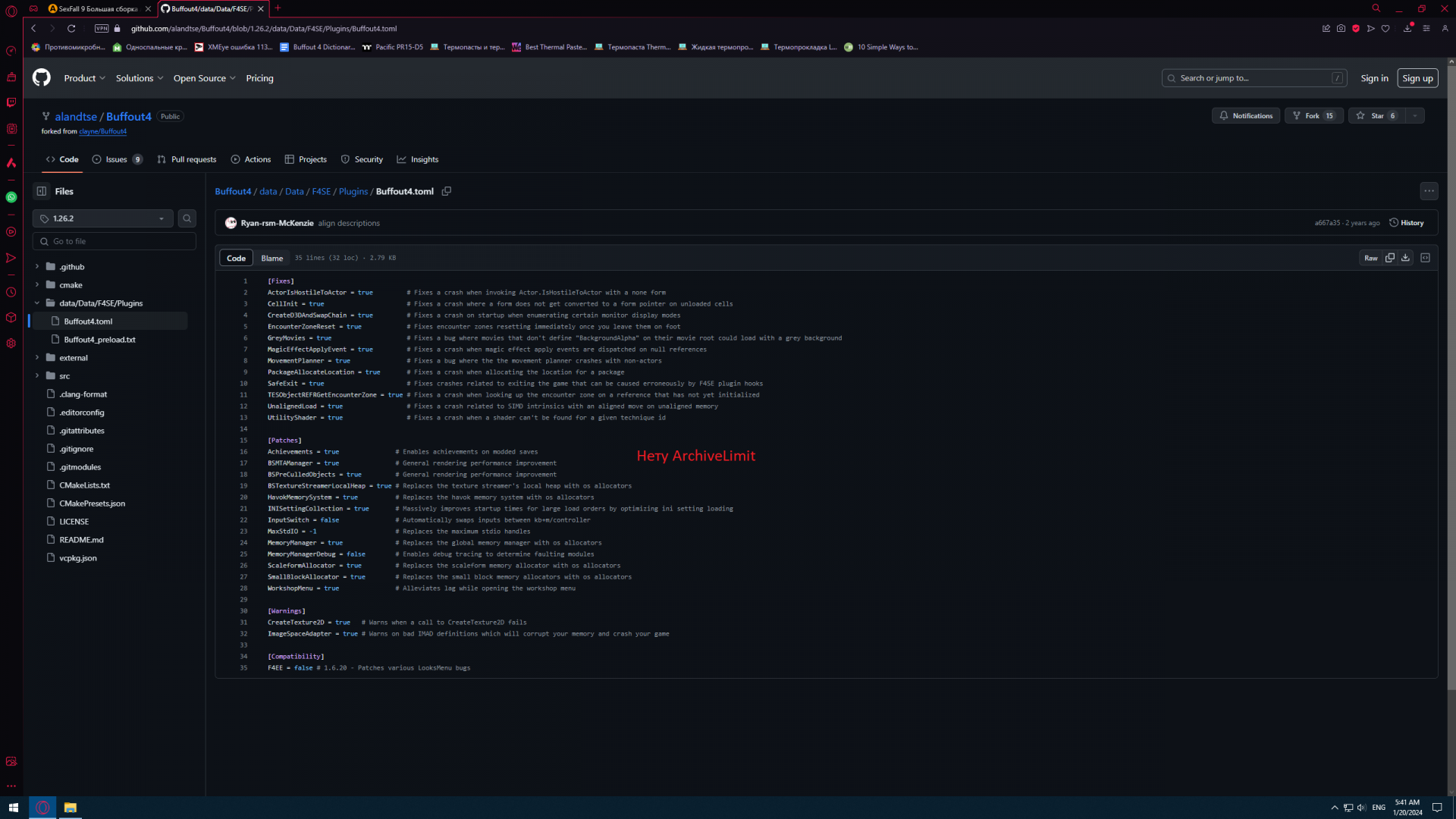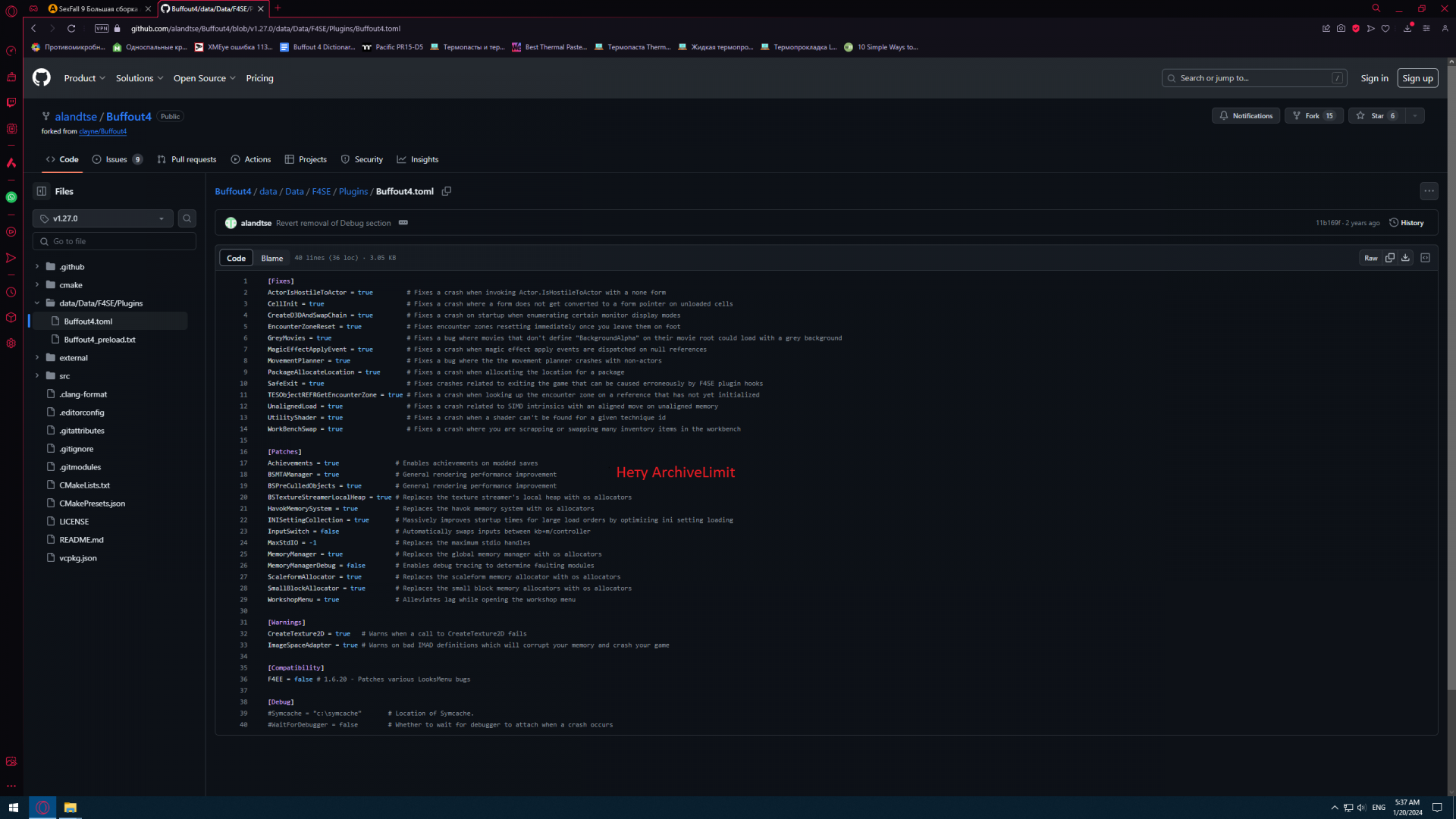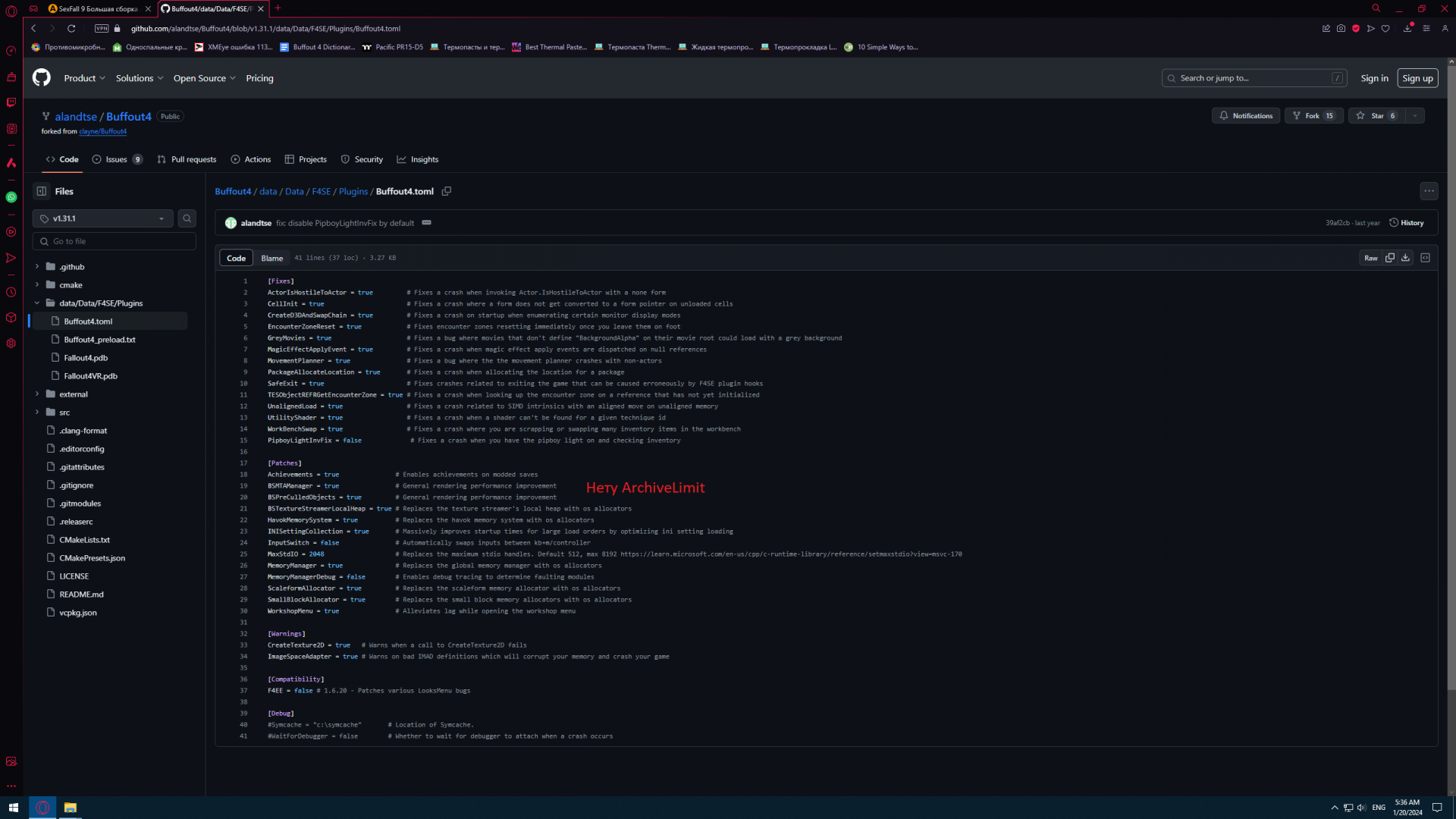 @aplayer Спасибо, я вообще не знал что Баффаут командная работа. И что они на Гит Хабе все эти годы были. Но я чего то вообще не понял что ха фигня происходит. Прошелся по всем билдам от 1-26-2 вплоть до 1-31-1 и ни в одном нету параметра ArchiveLimit. В версии на Нексусе и Геймер Модс есть. Мало того, там файл конфига старый как в 7й сборке. Buffout4.toml сразу в папке F4SE\Plugins в отличие от того что в сборке 9, где он в подпапке Buffout4. Такое ощущение что то что на Гит Хабе это ответвление. И такое может быть только если команда распалась.