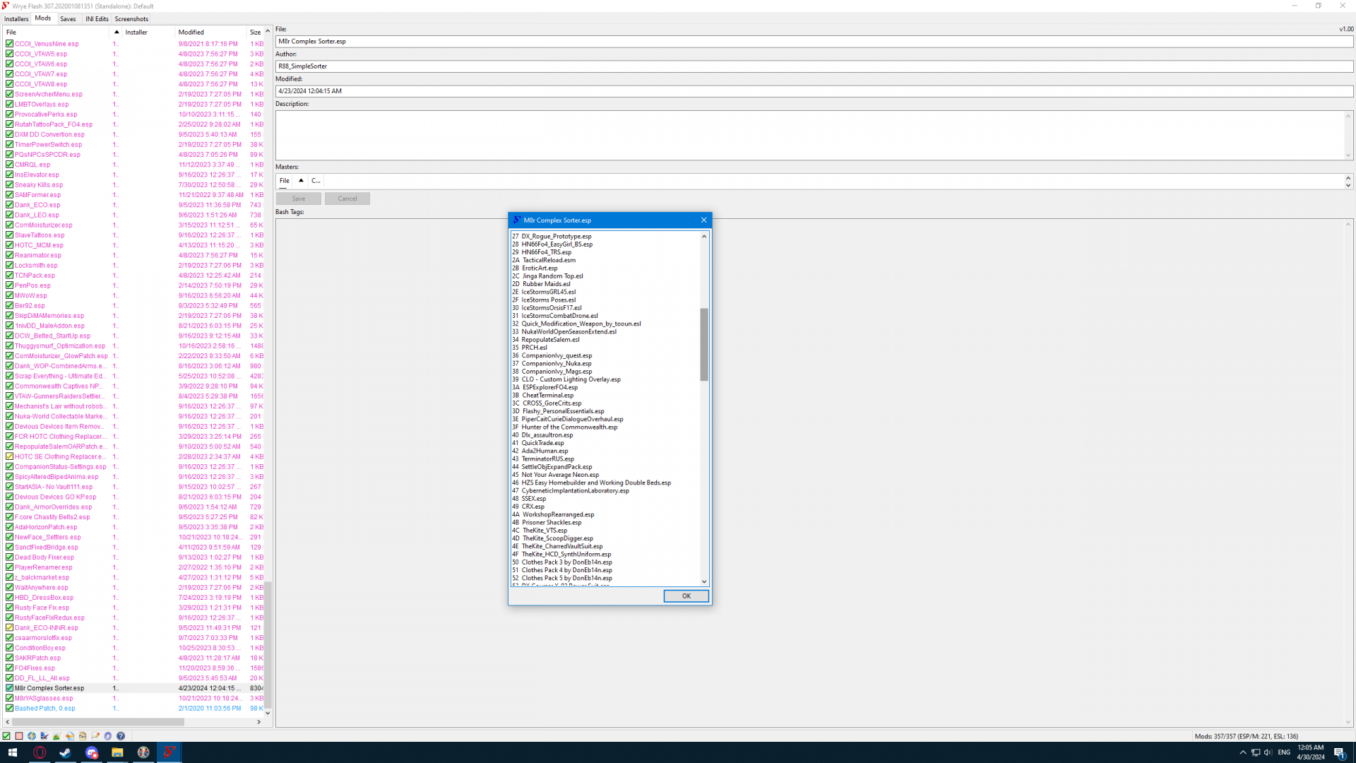 UPD: проверил, нет все в норме. Я не перепутал файлы. Этот M8r отвязан только от LivingIsPain.esl, Phase4DLC.esp и VTAW-GunnersRaidersSettlersGuardsPatch.esp. Если убрать их во Wrye Bash, M8r остается зеленым. Скорее всего ты что то еще отрубил из того что было в мастерах плагинах у M8r. Открой Wrye Bash. наведись на M8r и правой кнопкой вызови выпадающее меню. В нем выбери List Masters. Выйдет окно с мастер плагинами, там посмотри есть ли среди них какой-то который ты снес.