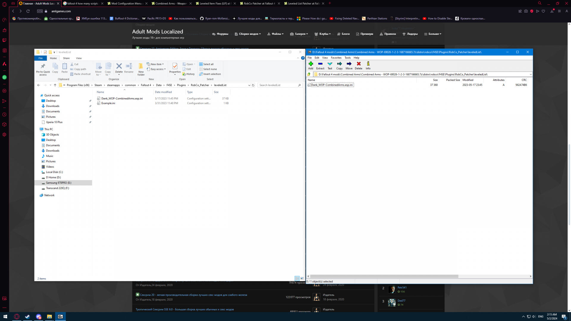 В общем файл Dank_WOP-CombinedArms.esp.ini из мода надо кинуть в Data\F4SE\Plugins\RobCo_Patcher\leveledList. Но и после этого шанс того что вы встретите кого то с оружием из CombinedArms мизерный. Я чуть не сдох от скуки занимаясь поисками, пока не встретил этого рейдера в Бостоне рядом с Боевой Зоной.