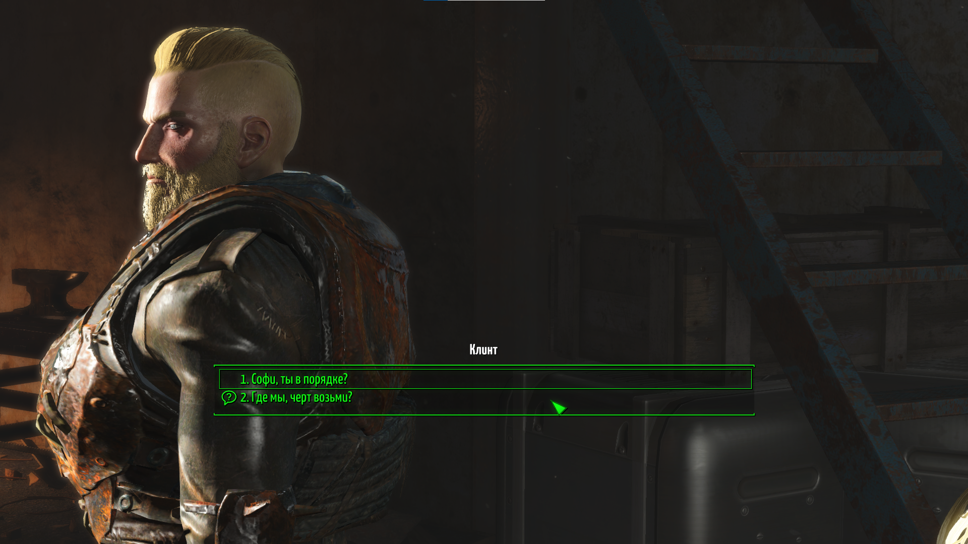 • Второй путь - Нюрита: отказаться от предложений робоглаза и запустится другая сюжетная линия в которой ЖГГ это альтернативная молодая девушка, жительница убежища, которая не имеет никакого отношения к персонажу классической игры. Не является женой Нейта и матерью Шона. Этот путь можно выбрать только если НЕ установлен Commonwealth Slavers, в противном случае рейдеры убьют Дюка.