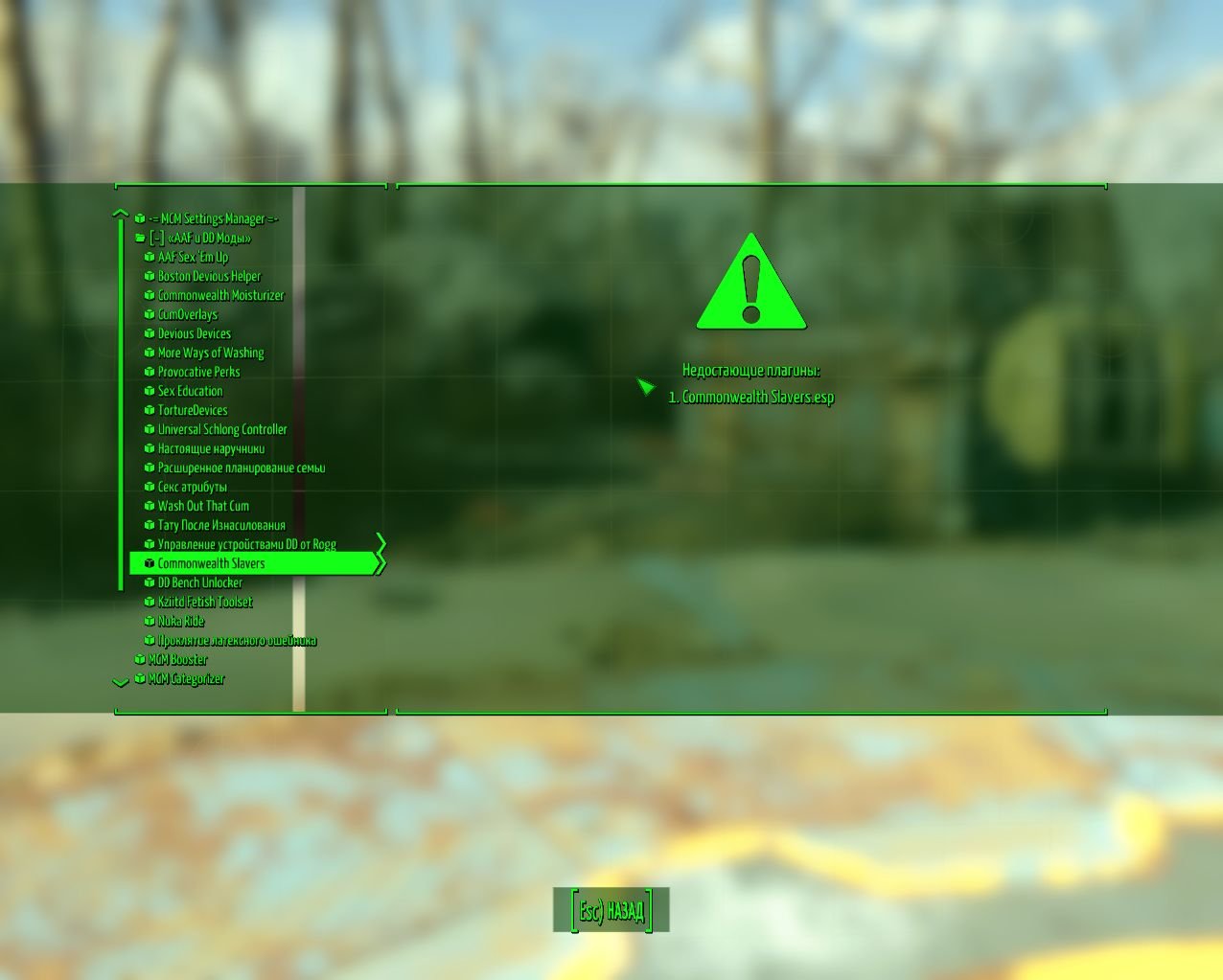 Ребят, была такая у кого проблема что ни игра ни МСМ не видят  (commonwealth slavers.esp)? Через AML активировал мод, файлы не потерялись, были помещены в дату. В баше проверял, он их видит и выставляет в заложенном порядке. Nuka Ride Прошёл замечательно, почти без танцев с бубнами... Тут же мод ни в какую не хочет заводиться