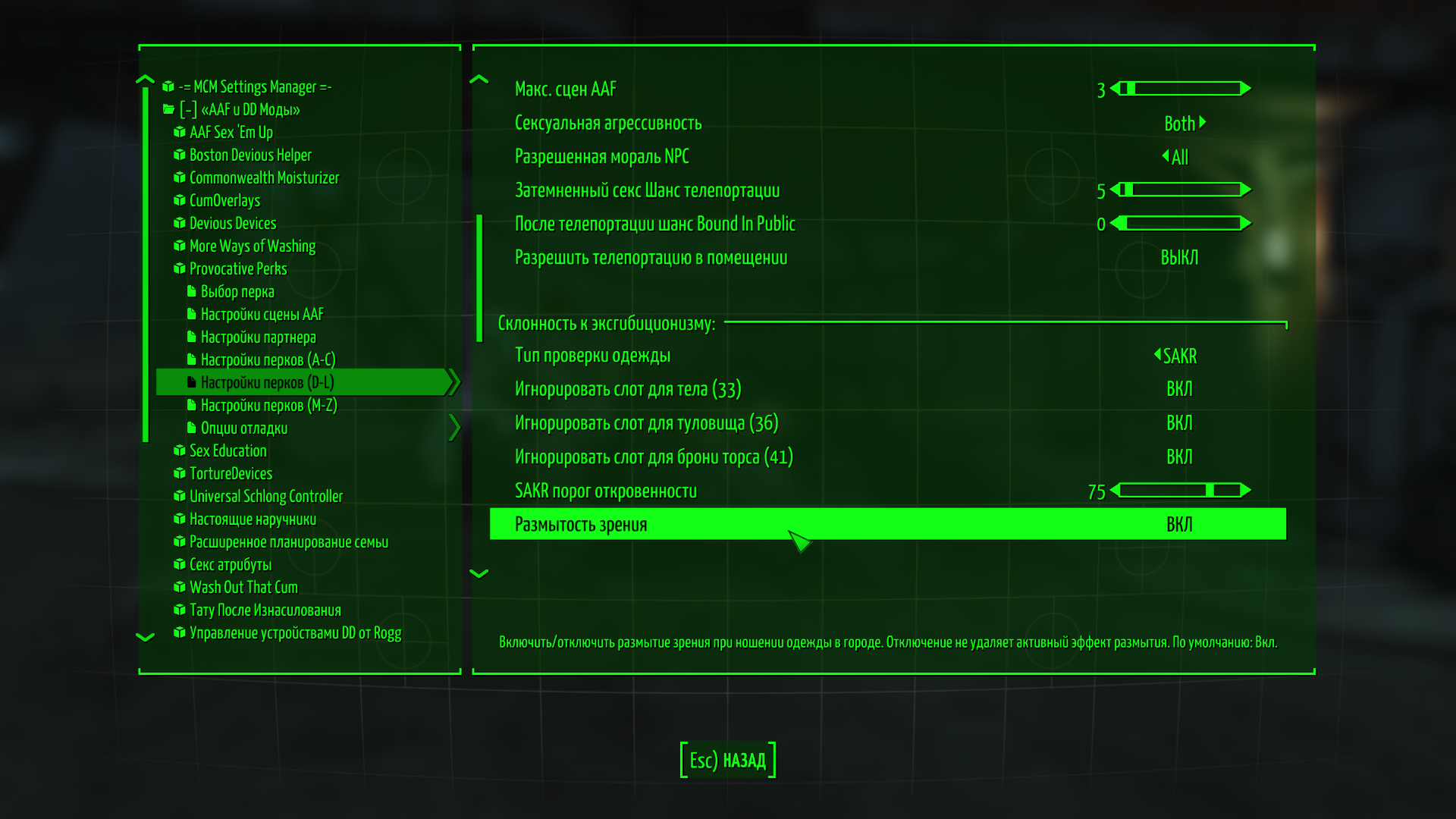 Похоже размытость во время диалогов вовсе не от наркотиков или первед перков зависит. Так и не изменилось ничего.  У меня сейчас другой вопрос. Как отключить запрет на одежду для ЖГ в ошейнике. Как только она пытается чтото надеть как ошеник бьёт током и сообщение появляется; Рабыни не могут носить одежду.
