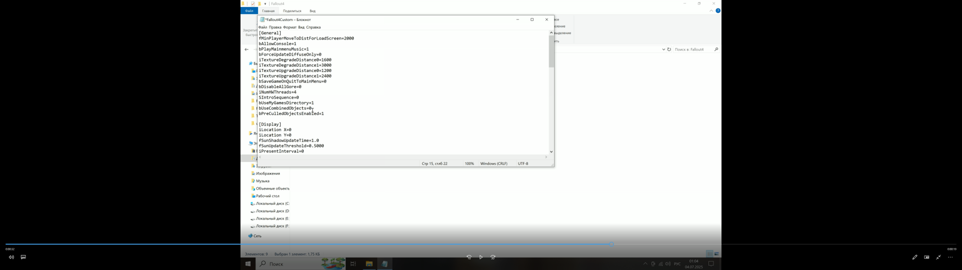В Документах в файле Fallout4Custom.ini изменить в строчке рядом с курсором 1 на 0.