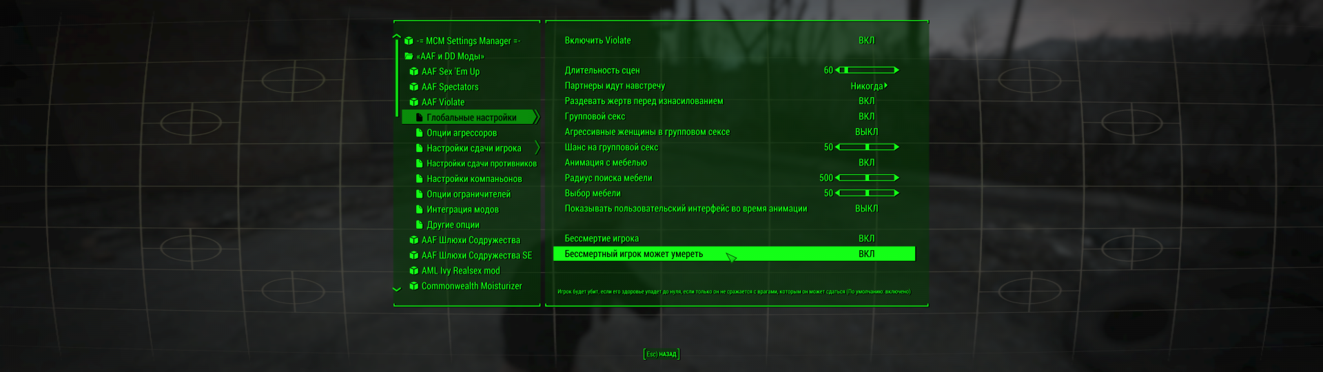 После изменения некоторых настроек в МСМ, опции: Hardcore Content, MCM Booster, Решейд могут стать отключёнными после включения. Не включайте их снова иначе настройки модов и МСМ сбросятся.