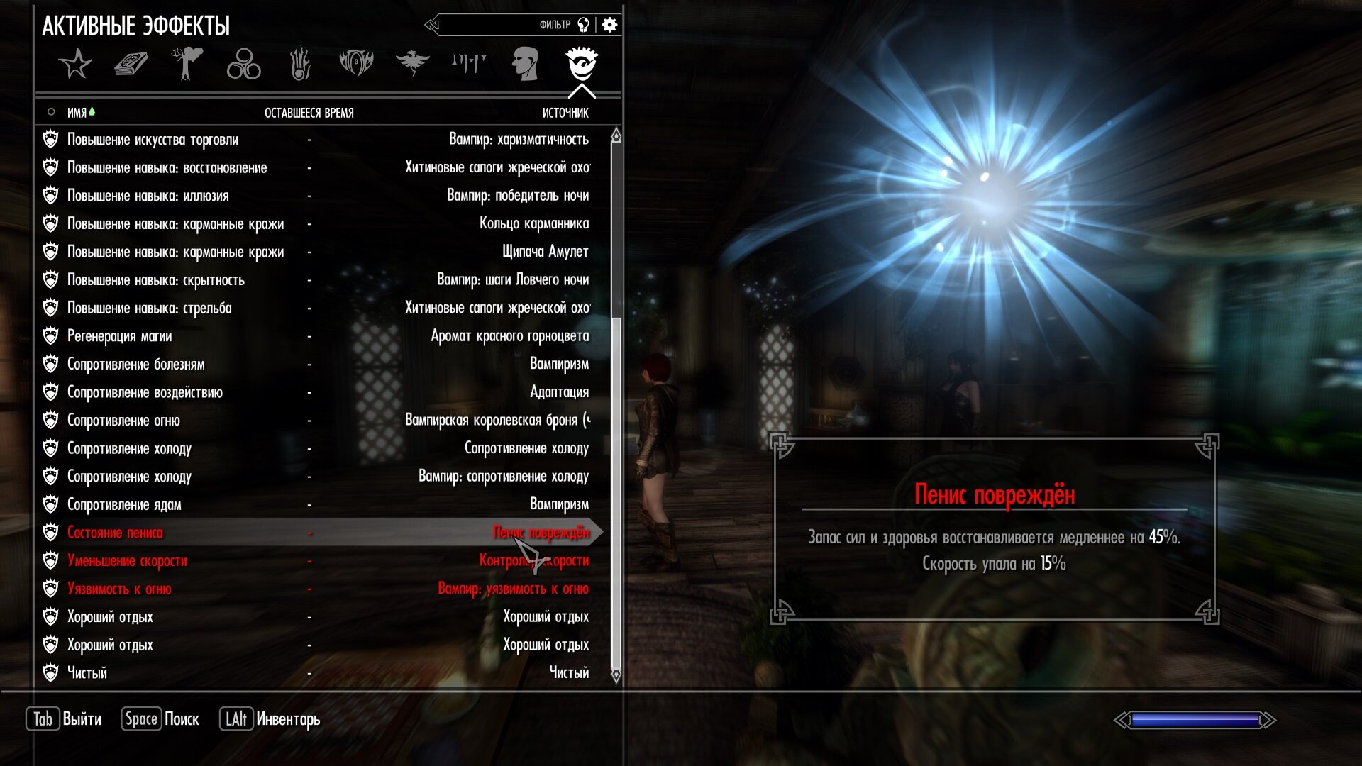 Снёс SexLab STDs и почистил сохранение. тогда повреждённый пенис исчез из дебафов