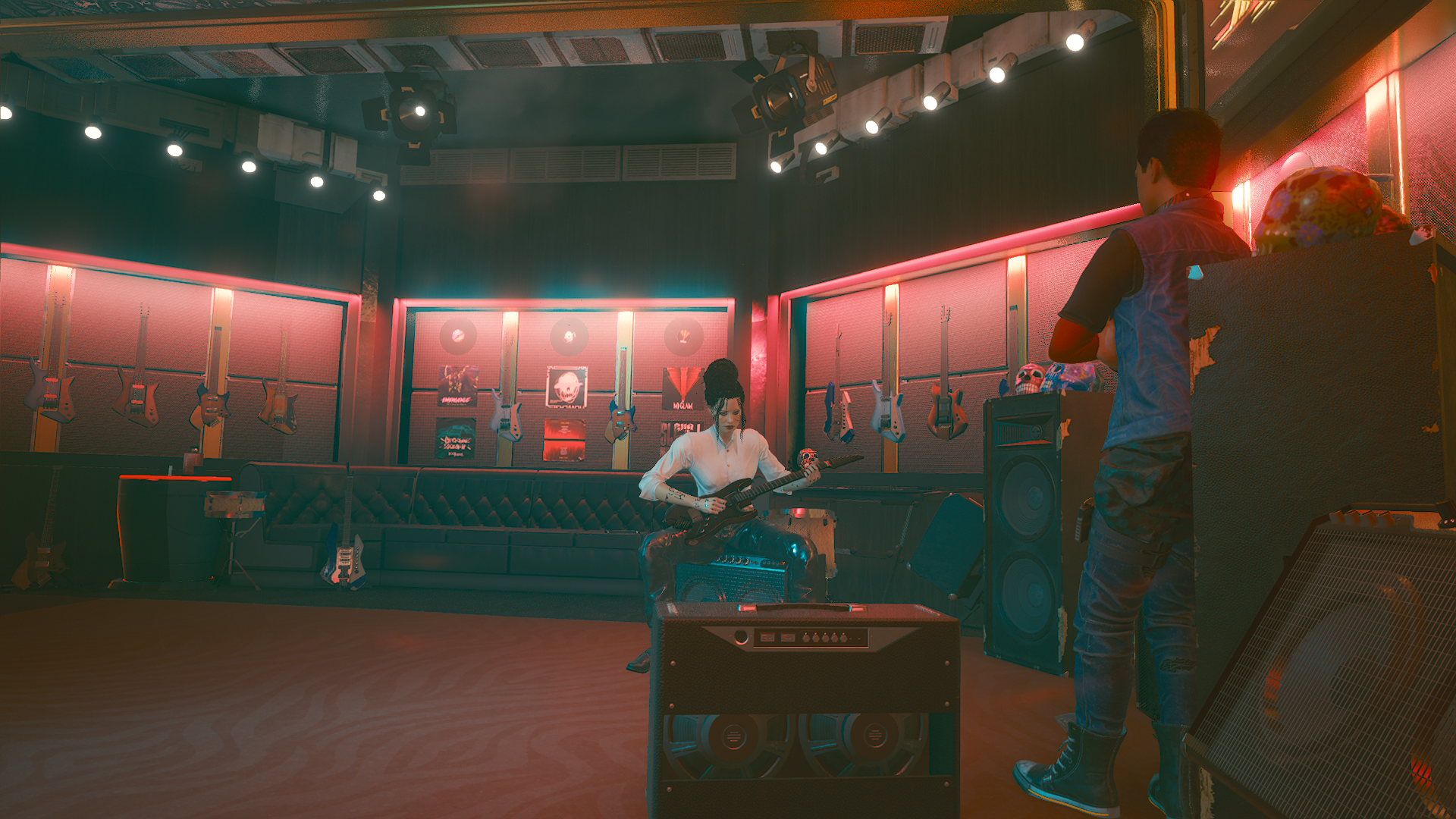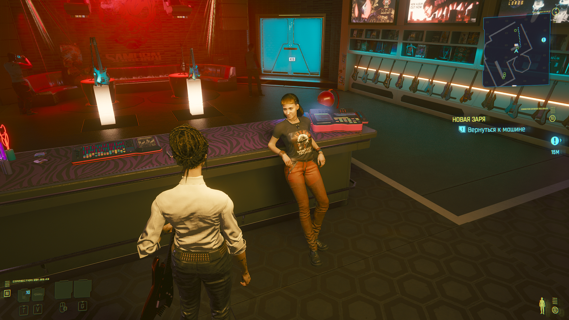 В магазине музыкальных инструментов. Она выбирает самую лучшую и дорогую гитару, что бы подарить ему.