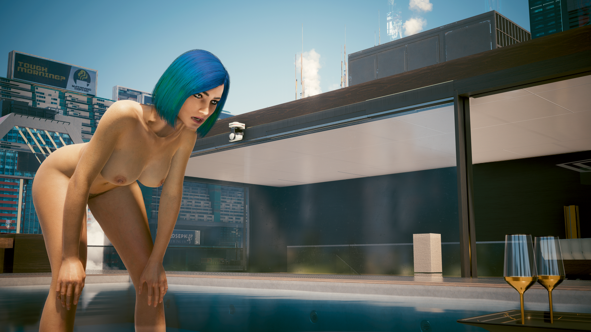 С разными телами и причёсками. В отражённом свете от поверхности воды в мини бассейне.