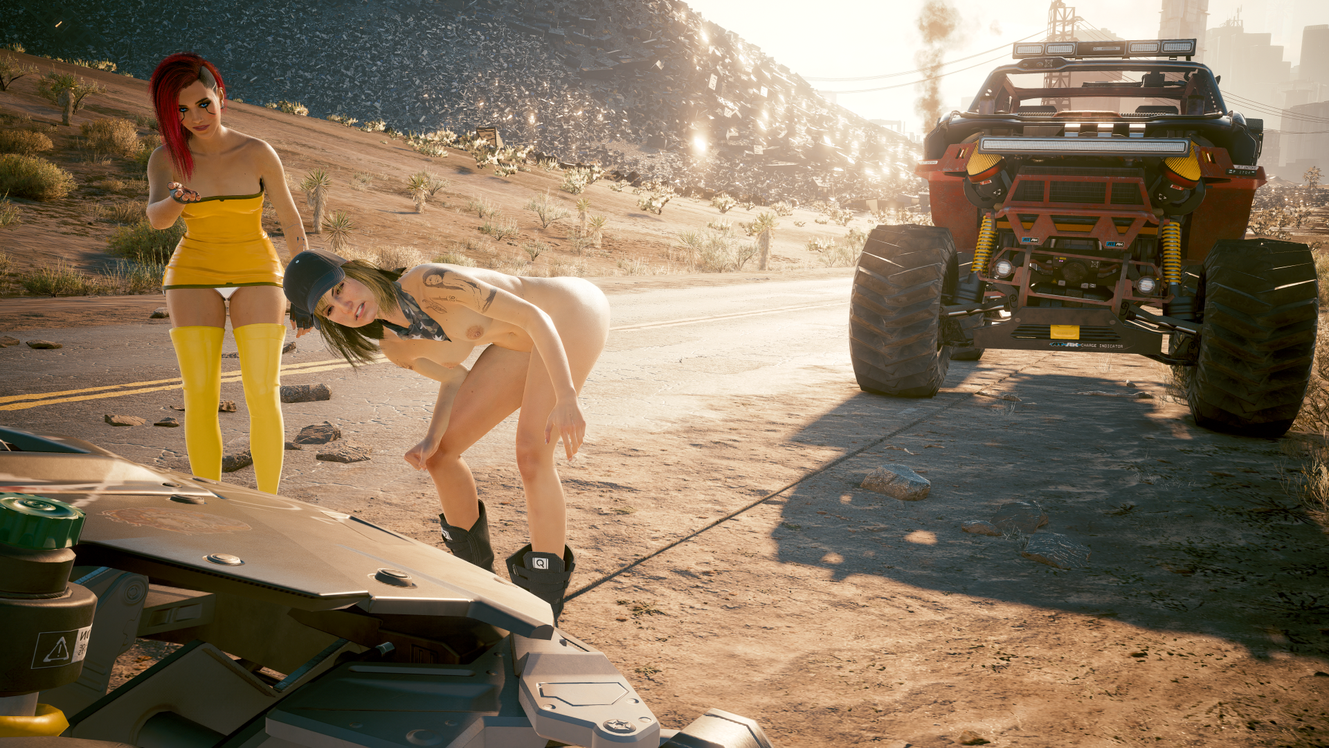 Оказывается, что Ви не только красотка, но так же и умница! Нудистка кочевница:-"А ты сможешь довезти меня до лагеря - здесь не далеко?". A у не везучей блондинки и новая машина заглохла на трассе.