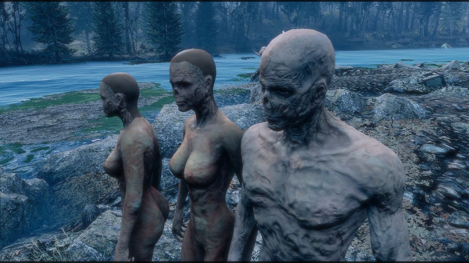 Дикие гули не ходили как зомбаки, но выглядели спокойно смотрящими на реку..
