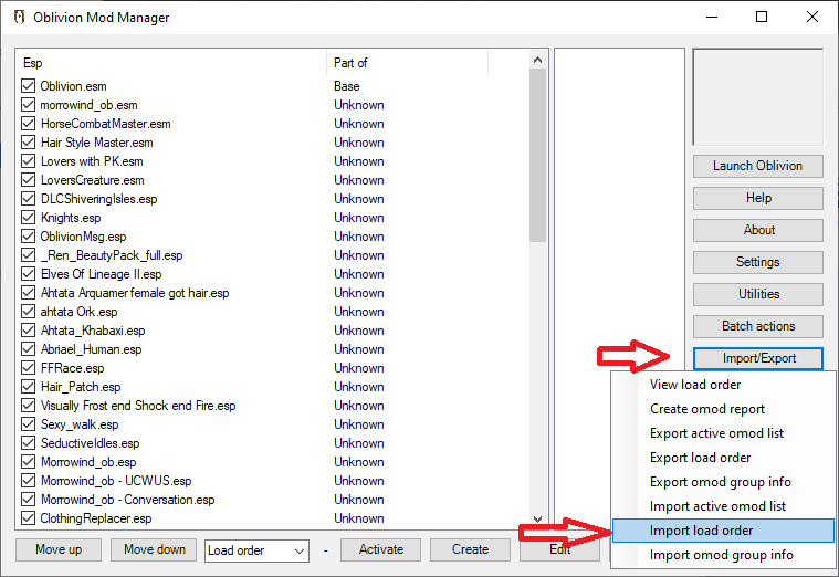 Нажимаем кнопу справа - "Import/Export", нажимаем кнопку "Import Load order", находим файл - "Load order" (он в папке - "Порядок загрузки модов и установка") нажимаем открыть. Теперь все моды будут установлены в правильном порядке.