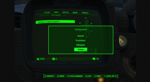 Просмотреть файл Vinfamy-CP-1_4-rus Этот мод добавляет множество опций и настроек ко всем модам Vinfamy. Вы можете настроить пол агрессоров, частоту подходов клиентов в режиме проституции, частоту сканирования и т. д. Все настройки находятся в вашем пипбое, в "Контрольной панели Vinfamy". Violate - содержит множество настроек капитуляции игрока и врагов, пороги здоровья, пол агрессоров и т. д. Kidnapped - содержит множество настроек похищения, различные штрафы в городах и поселках и т. д. Autonomy - содержит настройки частоты сканирования, вероятности гей, лесби и гетеро, разрешение компаньонов и т. д. Vanilla Fudge - множество настроек пола НПС, флирта, награда сексом за выполнение задания и т. д. Prostitution - настройки подхода клиентов к игроку, обмен комментариями между клиентами перед сексом, остановка всех боев в режиме проституции, повторный подход клиентов и т. д. Family Planning - можно настроить шансы на беременность в половом акте, будут ли НПС пользоваться презервативами или таблетками и т. д. Требования Fallout 4 и все DLC Four-Play Violate Four-Play Kidnapped Four-Play Autonomy Four-Play Vanilla Fudge Four-Play Prostitution Four-Play Family Planning Что нового в версии 1.4 1.4 - добавить опцию исключить / включить враждебные фракции в качестве клиентов для публичных домов в FP Prostitution 2.4+ 1.4 - Повышенный приоритет квеста, может помочь людям, у которых есть проблемы с инициализацией. 1.3 - Теперь CP может быть поднят с помощью правой клавиши управления. Он больше не будет занимать ни одного слота. Убрали странное уведомление в конце каждой сексуальной сцены, которую я забыл удалить в 1.2. 1.2 - Добавить два режима выбора: выбрать одежду в инвентаре, чтобы ее нельзя было раздеть во время секса, и специально выбрать индивидуального собеседника, который можно выбрать с помощью модов с четырьмя играми. Добавлены параметры настройки для планирования семьи Предотвратите добавление нескольких копий панели в ваш инвентарь. Установка: Папку Data копируем в основную папку с игрой, соглашаемся на слияние и замену файлов. Подключаем мод в программе врайбаш. Требования: Fallout 4 - 1.10.111 F4SE 0.6.12 (http://f4se.silverlock.org/) Four-Play 0.0.8.2 + Four-Play Community Patch 2.6.1 Автор kontinym Добавлен 04.10.2018 Категория Базовые моды Автор vinfamy Сайт оригинала https://www.loverslab.com/files/file/4176-vinfamys-control-panel-hotkey-no-biped-slot/